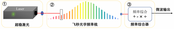 超穩(wěn)光生微波源主要由超穩(wěn)激光器、飛秒光學(xué)頻率梳和微波頻率綜合器這三部分組成,如圖 5所示。超穩(wěn)激光器提供超級(jí)穩(wěn)定的單頻激光信號(hào),它是超穩(wěn)微波的參考源,它的頻率穩(wěn)定度制約著所產(chǎn)生的微波的頻率穩(wěn)定度。飛秒光學(xué)頻率梳用來(lái)搭建一條連接超穩(wěn)激光信號(hào)和超穩(wěn)微波信號(hào)的橋梁,讓超穩(wěn)激光直接將頻率穩(wěn)定度傳承給超穩(wěn)微波,得到光生微波信號(hào)。微波頻率綜合器,可以將飛秒光梳傳遞的微波信號(hào)變換至任意希望的頻率值上。