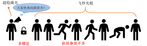 如果把超穩(wěn)光生微波源比作排隊(duì)走的隊(duì)列,那么超穩(wěn)激光就像隊(duì)列里面的帶隊(duì)人,隊(duì)伍的步伐大小、整齊度、每位隊(duì)員的相對(duì)位置都由這個(gè)領(lǐng)隊(duì)決定。飛秒光梳就像隊(duì)列里面的隊(duì)員,在沒(méi)有和超穩(wěn)激光建立聯(lián)系之前,光梳是自由運(yùn)轉(zhuǎn)的,就如圖 6中所示的一樣混亂。而當(dāng)通過(guò)一系列復(fù)雜的操作和領(lǐng)隊(duì)建立聯(lián)系后,就能使得每位隊(duì)員的步伐大小、步速、以及和其他隊(duì)員的相對(duì)位置都和領(lǐng)隊(duì)高度同步,如同圖 7所示,這樣就產(chǎn)生的超穩(wěn)光生微波信號(hào)。