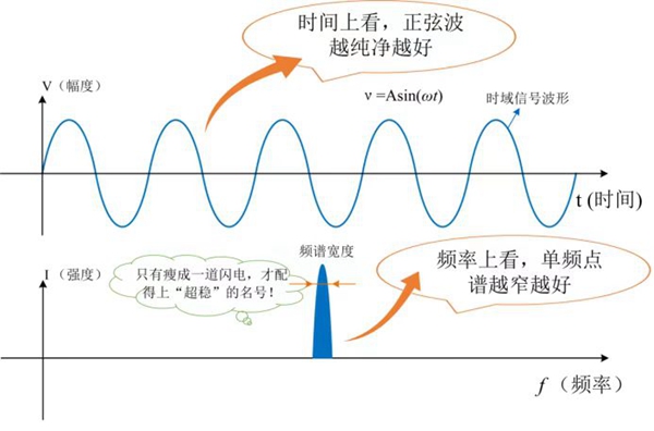 從時(shí)間尺度上看,超穩(wěn)微波信號(hào)是指周期連續(xù)、頻率單一的正弦波;而從頻率尺度上看,超穩(wěn)微波信號(hào)是頻譜寬度很窄的信號(hào)。如圖2。時(shí)間上信號(hào)的波形越逼近正弦波,頻率成分就越單一、穩(wěn)定度就越穩(wěn)定,頻域上信號(hào)的譜線(xiàn)寬度越窄,相位噪聲就越低。