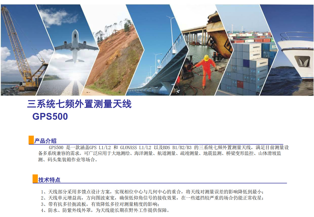 GPS500 是一款涵蓋GPS L1/L2 和 GLONASS L1/L2 以及BDS B1/B2/B3 的三系統(tǒng)七頻外置測(cè)量天線,滿足目前測(cè)量設(shè)備多系統(tǒng)兼容的需求。可廣泛應(yīng)用于大地測(cè)繪、海洋測(cè)量、航道測(cè)量、疏竣測(cè)量、地震監(jiān)測(cè)、橋梁變形監(jiān)控、山體滑坡監(jiān)測(cè)、碼頭集裝箱作業(yè)等場(chǎng)合。...