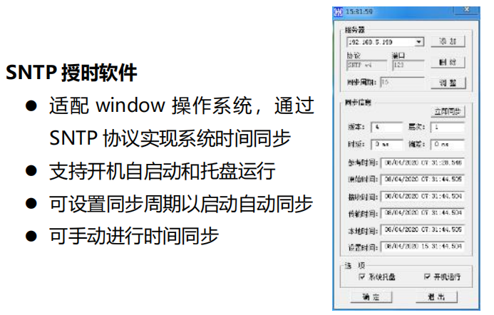-技術(shù)指標(biāo)- 網(wǎng)絡(luò)和服務(wù) ●NTP v1/2/3/4(單播/多播/廣播/Autokey),SNTP; ●Telnet,SSH,F(xiàn)TP; ●SNMP v1/2/2c/3,MIB II (RFC1213); ●IPv4、IPv6、IPv4/IPv6 Hybrid。 服務(wù)性能 ●衛(wèi)星參考下同步精度 :<100ns; ●用戶容量 :>5,000,000; ●NTP請求量 :≧139000次/秒; ●可通過軟件配置支持IEEE1588v2(PTP)協(xié)議。