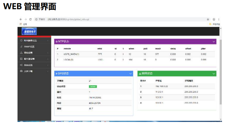 ●方便快捷、開箱即用,用于對設(shè)備進(jìn)行全局監(jiān)控; ●含設(shè)備運(yùn)行狀態(tài):NTP狀態(tài)、北斗/GPS狀態(tài)、網(wǎng)絡(luò)狀態(tài)等; ●可進(jìn)行SNMP設(shè)置(Trap地址等)、網(wǎng)絡(luò)設(shè)置、NTP設(shè)置; ●可開關(guān)服務(wù)器當(dāng)前運(yùn)行的服務(wù); ●可下載相關(guān)配置文件和MIB描述文件。