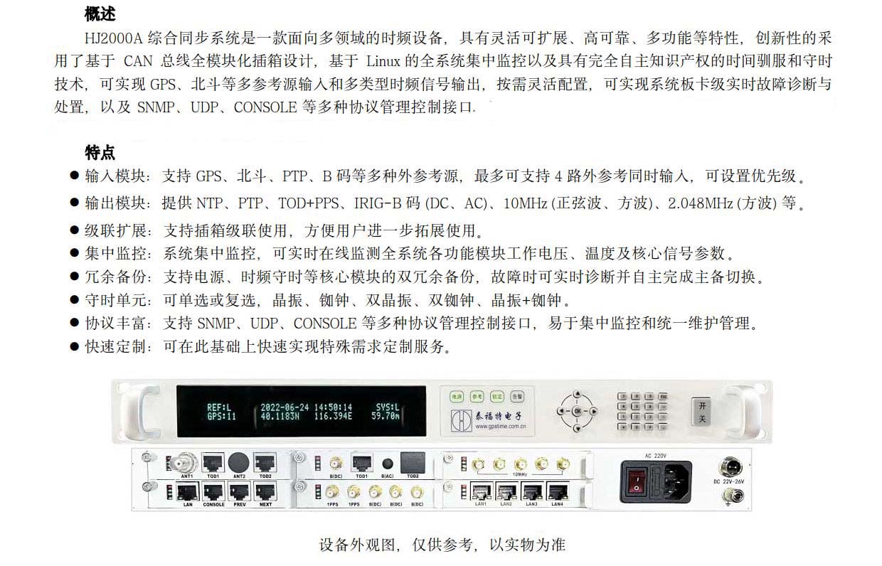 HJ2000A 綜合同步系統(tǒng)是一款面向多領(lǐng)域的時頻設(shè)備,具有靈活可擴(kuò)展、高可靠、多功能等特性,創(chuàng)新性的采用了基于CAN總線全模塊化插箱設(shè)計,基于Linux 的全系統(tǒng)集中監(jiān)控以及具有完全自主知識產(chǎn)權(quán)的時間馴服和守時技術(shù),可實現(xiàn) GPS、北斗等多參考源輸入和多類型時頻信號輸出,按需靈活配置,可實現(xiàn)系統(tǒng)板卡級實時故障診斷與處置,以及 SNMP、UDP、CONSOLE 等多種協(xié)議管理控制接口,可廣泛應(yīng)用于...